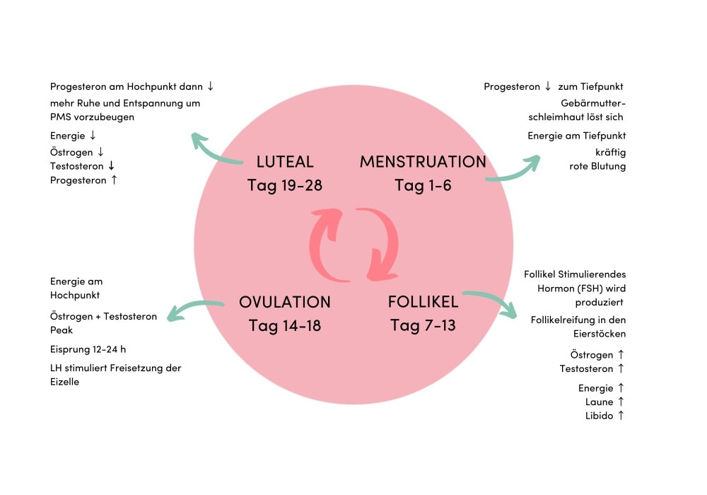 Im Laufe eines vollständigen Zyklus bereitet sich der Körper, durch das Heranreifen von Eizellen und dem Aufbau der Gebärmutterschleimhaut, auf eine mögliche Schwangerschaft vor. Kommt es zu keiner Befruchtung der Eizelle, wird die Gebärmutterschleimhaut mit der Menstruation abgestoßen und der Zyklus beginnt wieder von vorne.